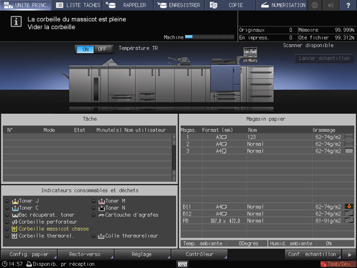 L'indicateur [Corbeille massicot chasse] dans la zone Indicateurs consommables et déchets de l'écran [UNITÉ PRINC.] s'allume en rouge et la couleur du texte devient jaune.