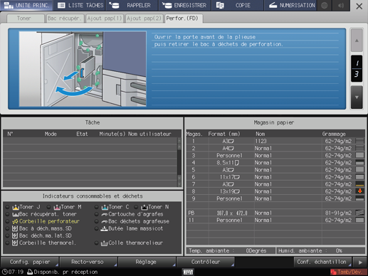 Appuyez sur l'indicateur [Corbeille perforateur] dans la zone des indicateurs des consommables et des déchets de l'écran [MACHINE].