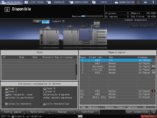 Appuyez sur [ON] pour le sélecteur de chauffage interne du thermorelieur sur l'écran [MACHINE] pour lancer le préchauffage du thermorelieur. Le message à droite du sélecteur de chauffage interne du thermorelieur passe de [Coupure TR] à [Préchauffe TR].