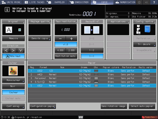 Pour en savoir plus sur la procédure du réglage papier couvertures de l'écran [Réglage papier], voir Réglage papier : réglage papier du magasin.