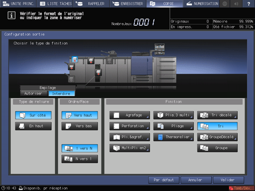 Appuyez sur [Autoriser] si vous autorisez l'empilage de plusieurs tâches dans le plateau d'empilage ou appuyez sur [Interdire] dans le cas contraire, puis cliquez sur [Valider].