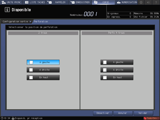 Pour rétablir le réglage précédent, appuyez sur [Annuler]. Pour annuler la fonction de perforation et enregistrer le réglage actuel, appuyez sur [Désactiver]. L'écran [Réglage sortie] réapparaît.