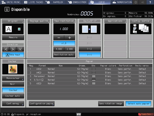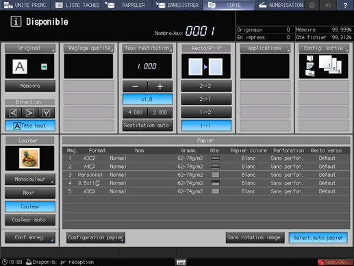 L'[Ecran par défaut] peut être défini sur l'écran [Tâche en attente] de l'écran [LISTE TRAVAUX] ou sur l'écran [En impression] de l'écran [LISTE TRAVAUX]. Pour afficher l'écran [COPIER], appuyez sur l'onglet [COPIER] dans les deux cas.