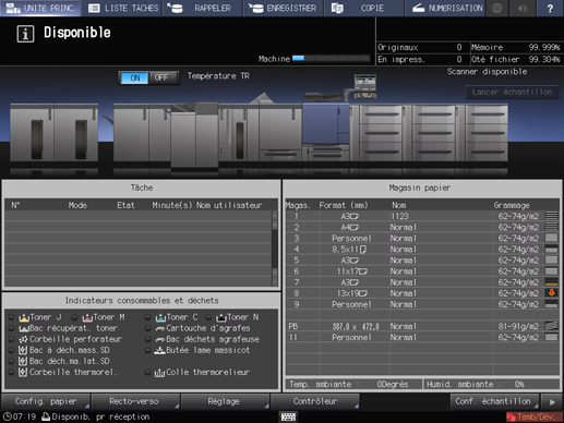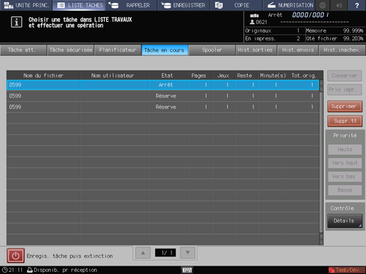 Vous pouvez modifier l'ordre des tâches en impression ou annuler des tâches réservées sur l'écran [LISTE TRAVAUX]. Pour en savoir plus, voir Présentation de l'écran LISTE TRAVAUX.
