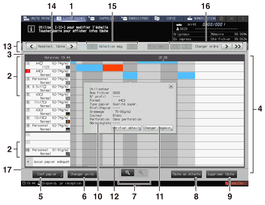 10 | Dialogue Configuration papier | S'affiche lorsqu'on appuie sur une barre dans l'affichage par barres de tâche. Il présente la configuration papier et la configuration papier détaillée de la tâche sélectionnée. |