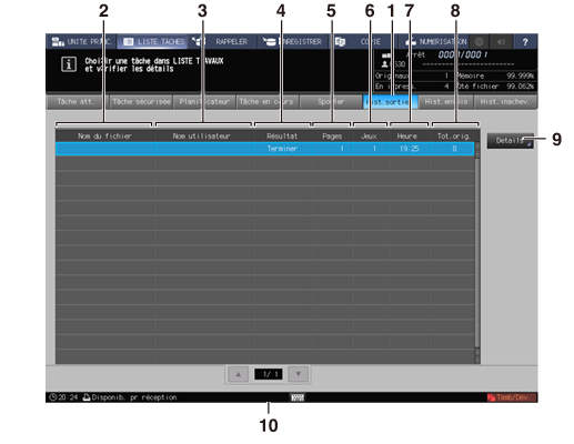 4 | [Résultat] | Affiche le résultat de sortie tel que Terminé ou Annulé. |