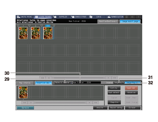 28 | Onglet [Insertion doc.] | Appuyez sur cet onglet pour insérer les données d'insertion image sélectionnées dans le fichier image du travail retenu. |