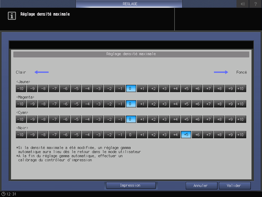 Assurez-vous d'effectuer le contrôle manuel de la densité couleur après avoir changé la densité maximale.