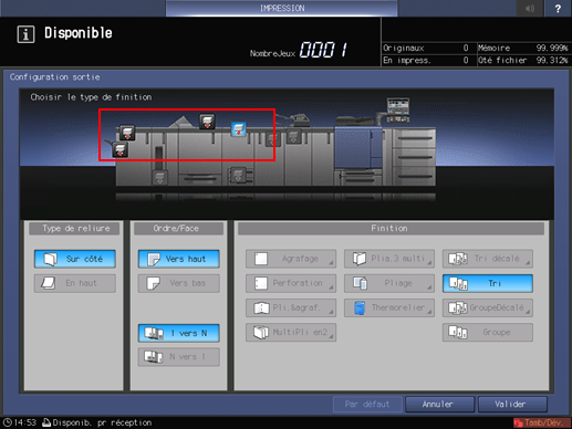 Sélectionnez le bac de sortie souhaité en appuyant sur la touche correspondante, puis appuyez sur [Valider].