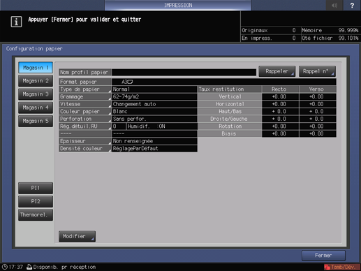 Appuyez sur l'onglet [Réglage papier] de l'écran [IMPRESSION] pour afficher l'écran [Réglage papier] et appuyez sur [Modifier].