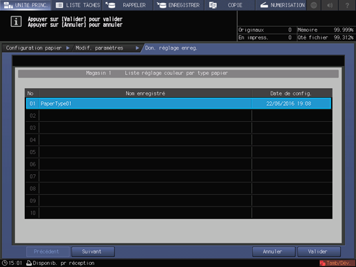 Pour utiliser les données de réglage du capteur pour chaque type de papier pour la correction, appuyez sur [Données réglage enregistrées]. Affichez l'écran [Liste pour réglage capteur couleur type papier] et sélectionnez les données de réglage du capteur couleur pour le type de papier souhaité et appuyez sur [Valider].