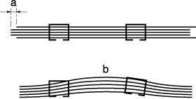 Vérifiez si le jeu agrafé présente un défaut d'alignement (a) (survenant si la largeur du papier spécifié est supérieure à la largeur réelle) ou est gondolé (b). (Survenant si la largeur du papier spécifié est inférieure à la largeur réelle)