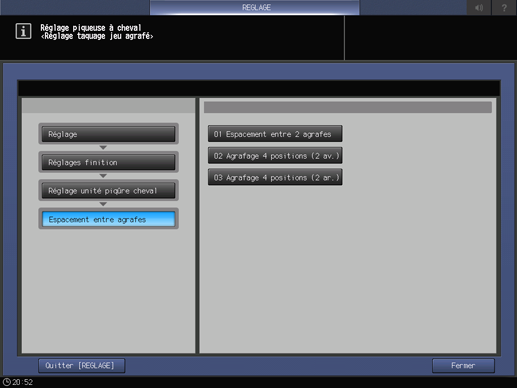 Appuyez consécutivement sur [Réglages finition], [Réglage unité piqûre cheval], [Espacement entre agrafes] et [Agrafage 4 positions (2 ar.)].