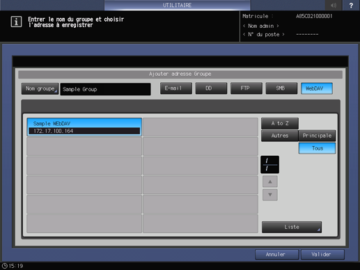 La sélection de [E-mail], [DD], [FTP], [SMB] ou [WebDAV] affiche les destinations enregistrées pour chaque option.