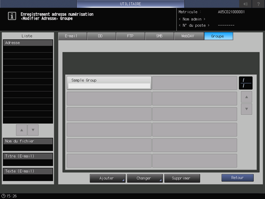 Vous pouvez enregistrer jusqu'à 50 destinations dans un groupe. Vous pouvez enregistrer plus d'une destination par groupe pour l'envoi d'e-mails. Vous ne pouvez enregistrer qu'une destination dans un groupe de chacun des éléments DD, FTP, SMB et WebDAV.