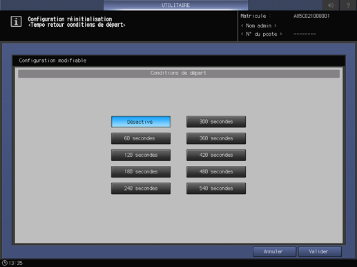 Appuyez consécutivement sur [Configuration système] sur l'écran [Menu Réglage utilisateur] et appuyez sur [Fonction réinitialisation] et [Conditions de départ].