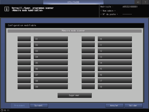 Appuyez sur l'onglet [Configuration système] de l'écran [Menu Réglage administrateur]. Appuyez consécutivement sur [Autorisation/Interdiction], [Programmes utilisateur] et [Mode scanner].