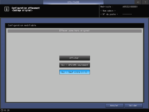 Appuyez sur [Configuration système] dans le [Menu Réglage administrateur] et appuyez consécutivement sur [Réglages expert], [Réglages effacement] et [Cadrage original].