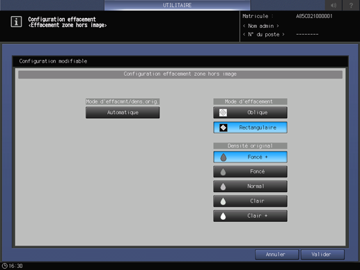 Définissez les réglages effacement et la densité original à utiliser lorsque la fonction Cadrage original est sélectionnée. [Auto] est sélectionné par défaut.