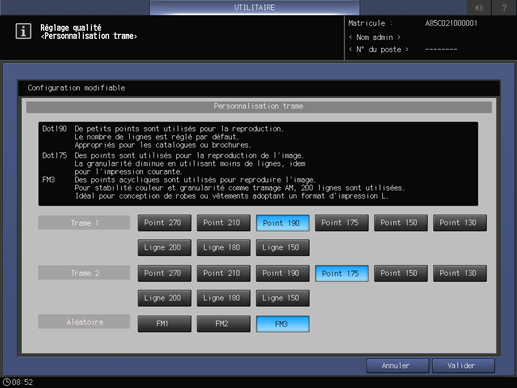 Point 120 est recommandé pour la trame 1. Nous recommandons d'utiliser Trame 1 pour les opérations habituelles. Si nécessaire, réglez la trame sur Trame 2 ou Aléatoire en fonction de votre tâche d'impression.