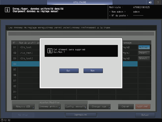 Appuyez sur l'onglet [Configuration système] de l'écran [Menu fonctions administrateur] et appuyez successivement sur [Réglages expert], [Réglages qualité], [Réglage uniformité densité] et [Enreg/Suppr données densité].