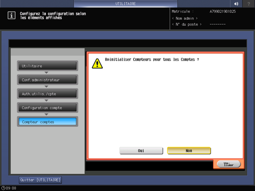 • Sélectionnez un élément et appuyez sur [RàZ compteur] pour afficher le dialogue de confirmation. Appuyez sur [Oui] ou [Non] et confirmez le réglage en appuyant sur [Valider].