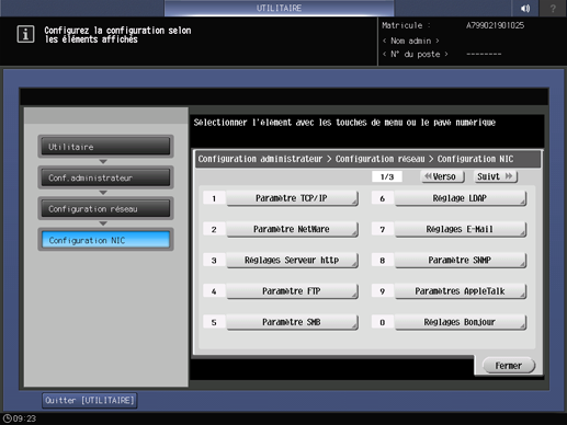 Appuyez sur l'onglet [Configuration réseau] de l'écran [Menu Réglage administrateur] et appuyez sur [Réglage NIC].