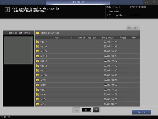 Appuyez sur l'onglet [Configuration sécurité] de l'écran [Menu Config. administrateur] et appuyez consécutivement sur [Configu.gest. de disque dur] et [Supprimer tâche sécurisée].