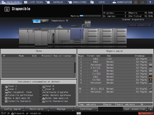 13 | Informations Magasin | Affiche le format, l'orientation, le nom et le grammage papier ainsi que la quantité de papier dans le magasin. |