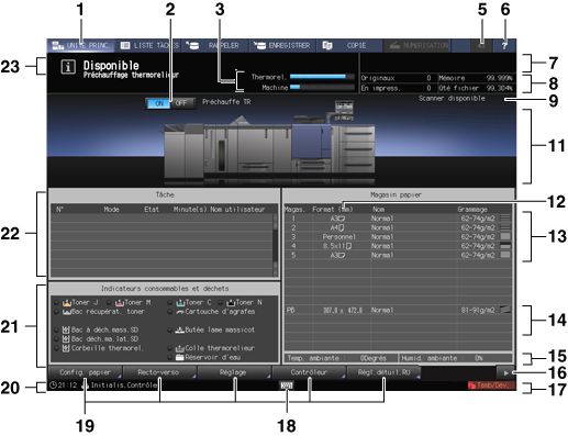 22 | Zone d'affichage des tâches | Affiche l'état actuel des tâches demandées à la machine. En cas de travaux incomplets, la touche [Hist. incomplet] s'affiche. |