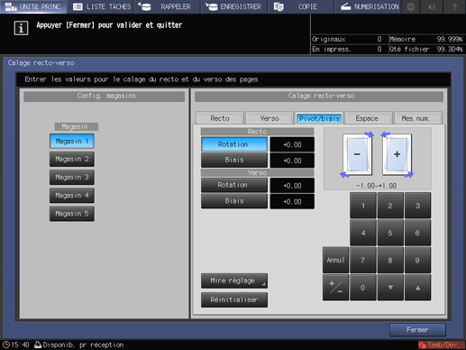 La valeur de réglage spécifiée dans [Pivot/biais] est conservée pour chaque magasin. Si le format papier du magasin est modifié, réglez à nouveau la valeur spécifiée dans [Pivot/biais] pour qu'elle corresponde au papier que vous utilisez.
