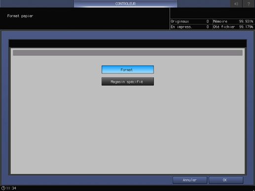 Cet écran s'affiche si vous sélectionnez [Réglage d'impression du pilote] - [Format papier] sur l'écran [Menu Configuration Contrôleur Machine]. Pour en savoir plus sur l'affichage de l'écran [Menu Configuration Contrôleur Machine], voir CONTROLEUR : réglage du contrôleur.