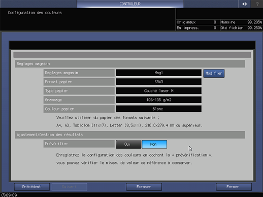 [Ajustement/Gestion des résultats] | Vérifie l'opérabilité de la configuration des couleurs. Lorsque vous enregistrez la configuration des couleurs, cette machine la vérifie sur la base du niveau de référence spécifié. |