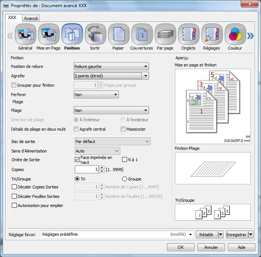Sélectionnez la finition du document imprimé. Sélectionnez les éléments suivants et procédez aux réglages nécessaires.