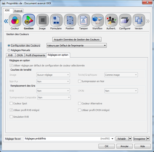 Si la case [Utiliser réglage par défaut de configuration de couleur sélectionnée] sous [Réglages en option] est cochée, supprimez la coche. Vous ne pouvez pas sélectionner la courbe de tonalité si cet élément est coché.