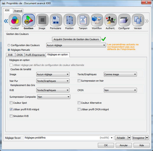 Pour assurer la stabilité des couleurs reproduites, procédez en plus de l'étalonnage régulier, aux autres réglages nécessaires de qualité image avant impression, par exemple en cas de changement de trame ou de papier ou si la teinte est un facteur important. Pour en savoir plus, voir Réglage de la qualité image avant impression.
