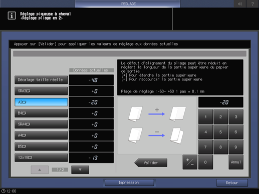 Cette fonction permet de régler le bord supérieur extérieur du papier plié (position de pliage) en cas de défaut d'alignement de la position de pliage en deux, en spécifiant la valeur qui convient.