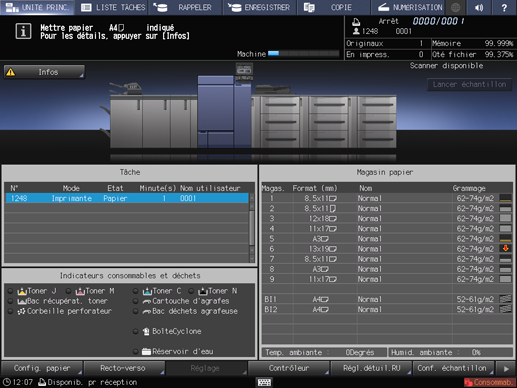Quand le magasin utilisé pour un mode copieur se vide, l'impression s'arrête et le message [Mettre papier $########## dans magasin$ / Pour les détails, appuyer sur [Infos]] s'affiche à l'écran.
