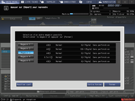 Le papier sera introduit à partir du magasin nouvellement sélectionné pour reprendre la tâche de sortie.