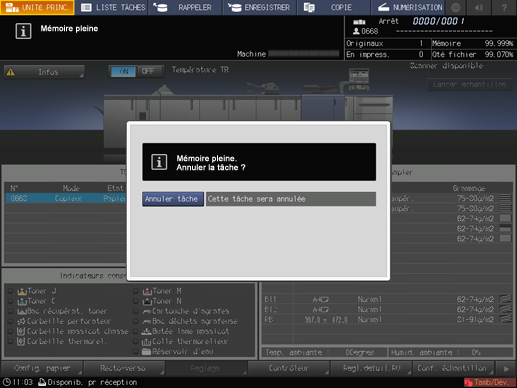 Quand un dépassement mémoire se produit lors de la numérisation du premier travail, la machine s'arrête immédiatement et affiche l'écran suivant.