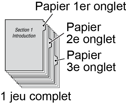 Exemple : 3 feuilles de papier à onglet sont insérées dans chacun des 3 jeux de finition (un total de 9 feuilles de papier à onglet)