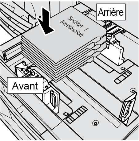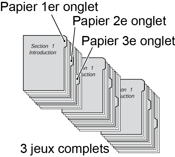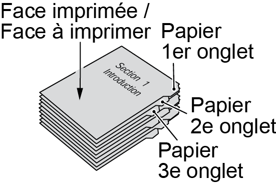 Exemple : 3 feuilles de papier à onglet sont insérées dans chacun des 3 jeux de finition (un total de 9 feuilles de papier à onglet)