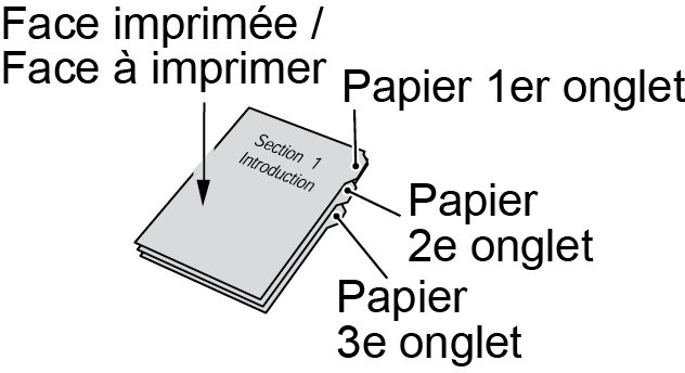 Exemple : 3 feuilles de papier à onglet sont insérées dans chacun des 3 jeux de finition (un total de 9 feuilles de papier à onglet)