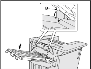 Insérez les supports (B) de l'unité bannière MK-740 ou du bac de sortie de renfort bannière MK-740m (bac d'extension de sortie) dans les fentes (b) du bac principal, tout en effectuant le réglage à la main.