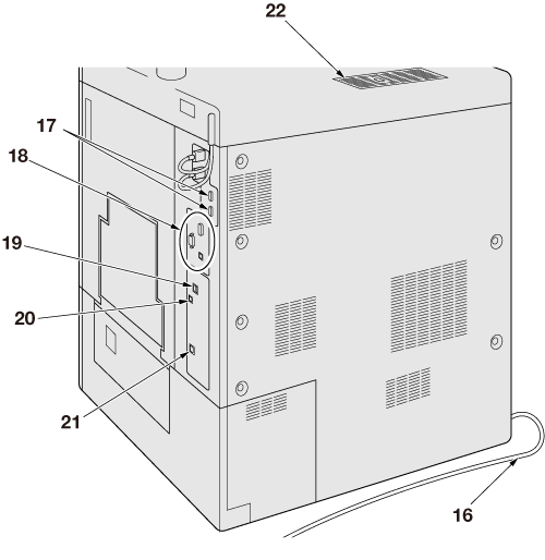 21 | Port réseau (10Base-T, 100Base-TX, 1000Base-T) | Reçoit un câble Ethernet pour utiliser la machine, ou se servir de la machine comme imprimante/scanner réseau. |