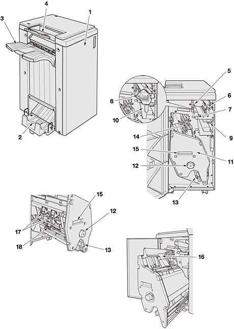 15 | Poignée [FN6] | Permet de tirer l'empileur pour l'élimination de bourrage papier dans l'empileur ou pour l’approvisionnement d'agrafes. |