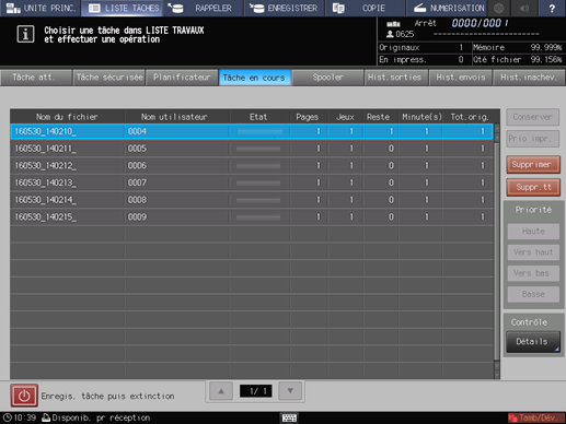 L'écran [RAPPELER] permet le traitement des tâches enregistrées sur le disque dur.