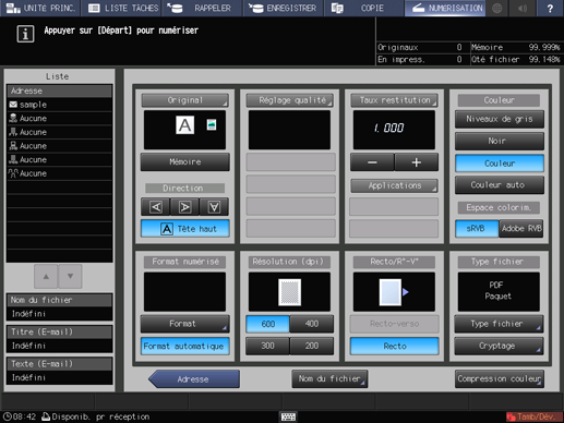 Les écrans de la fonction de numérisation englobent l'écran de sélection des adresses et l'écran de configuration des réglages de numérisation.