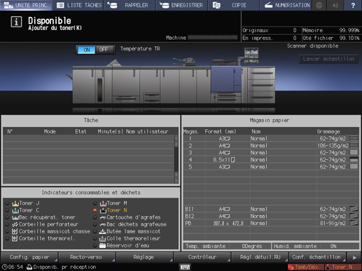 L'indicateur de couleur du toner à approvisionner s'allume en rouge et la couleur du texte devient jaune dans la zone [Indicateurs consommables et déchets] de l'écran [UNITÉ PRINC.].