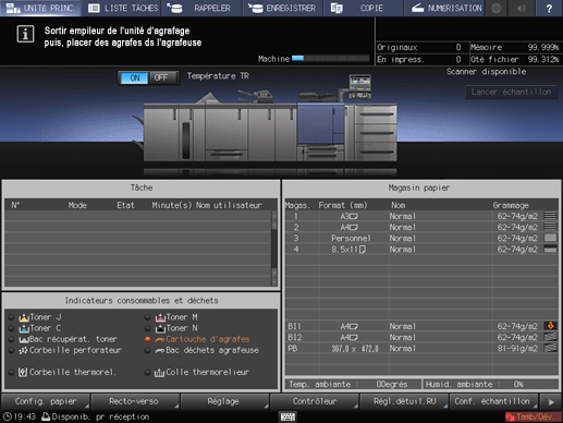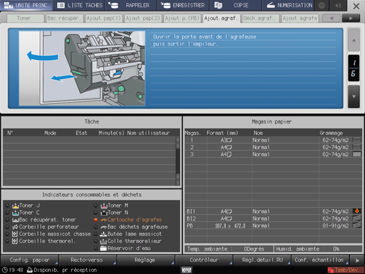 L'indicateur Cartouche d'agrafes dans la zone [Indicateurs consommables et déchets] de l'écran [UNITÉ PRINC.] s'allume en rouge et la couleur du texte devient jaune.
